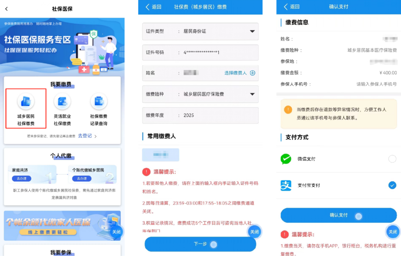 集中参保缴费期:2024年9月1日至12月31日 2025年度全省居民医保个人缴费标准统一为400元/人,居民医保财政补助标准不低于670元/人。集中参保缴费期内,参保用户仅需缴纳400元/人;在集中参保缴费期外参保的群众,将按照个人缴费标准加财政补助标准之和缴费,即需缴纳400+670=1070元/人。 温馨提醒: 1.新生儿、大学毕业生和退伍军人不受当年集中缴费时间的限定。 2.特困人员、低保对象、丧失劳动能力的一、二级重度残疾人等各类特殊人群可按规定享受参保资助。 “湘易办”全新上线的“社保医保”专区,集成“参保、缴费、个人代缴”等多个服务大类,涵盖城乡居民社保缴费、灵活就业社保缴费、家庭共济、个账代缴城乡居民医保、医疗保险参保登记、养老保险参保登记等多个服务事项,一个专区,实现参保、缴费一键直达。 登录“湘易办”APP,或“湘易办”支付宝、微信小程序,点击首页金刚区“社保医保”,即可进入“社保医保专区”。 在“社保医保专区”进入城乡居民社保缴费服务页面,填写需缴费的参保人员信息,选择城乡居民医疗保险缴费险种,并选择2025年缴费年度。核对信息无误后点击“下一步”进行缴费,然后选择支付方式,点击“确认支付”进行缴费。 完成缴费后,可以进入社保缴费记录查询服务查看缴费是否成功。 温馨提醒:如没有参保城乡居民医保,需先找到“我要参保”模块,在医疗保险参保登记分类下进入城乡居民参保登记服务,完成参保才能缴费。