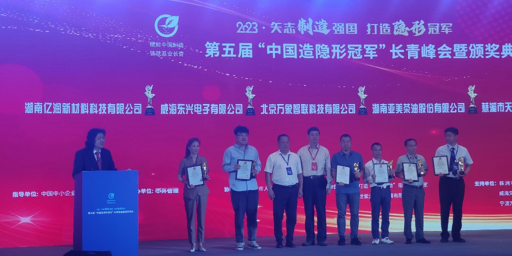 湖南亿润新材料科技有限公司参加第五届“中国造隐形冠军”长青峰会暨颁奖典礼,获得“时代匠人”称号。该项荣誉有助于提升亿润新材料在石墨烯发热材料领域的创新主导地位,助力亿润产品在湘销量保二争一,全面走向国内外市场。