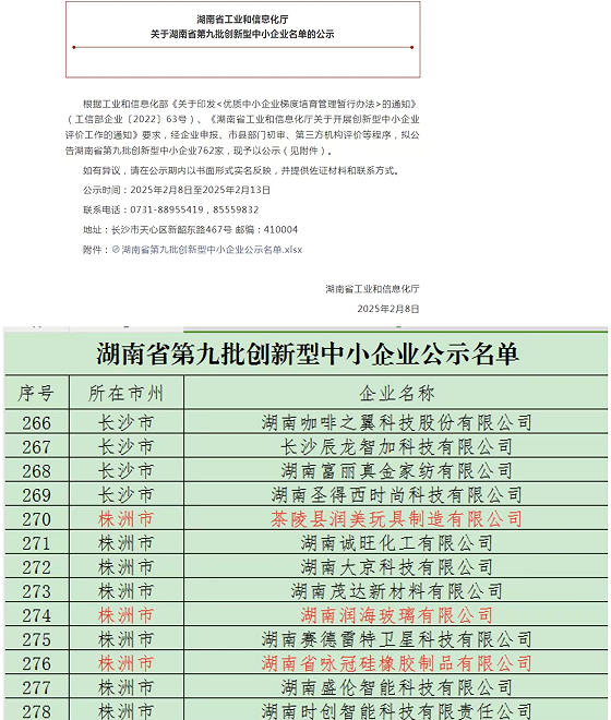 茶陵县在新年伊始便迎来喜讯,近日湖南省工信厅正式公布了第九批创新型中小企业名单,茶陵县再添3家企业入选,分别是茶陵县润美玩具制造有限公司、湖南润海玻璃有限公司、湖南省永冠硅橡胶制品有限公司。此批名单中全省共有762家企业成功入选,展现出湖南省在推动企业创新发展方面的显著成果。株洲市表现出色,有47家企业荣耀上榜,茶陵县的这3家企业崭露头角,为茶陵县的经济发展注入了新的活力与希望。