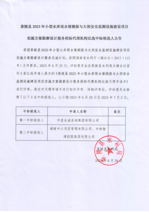 茶陵县2023年小型水库雨水情测报与大坝安全监测设施建设项目实施方案勘察设计服务招标代理机构比选中标候选人公告
