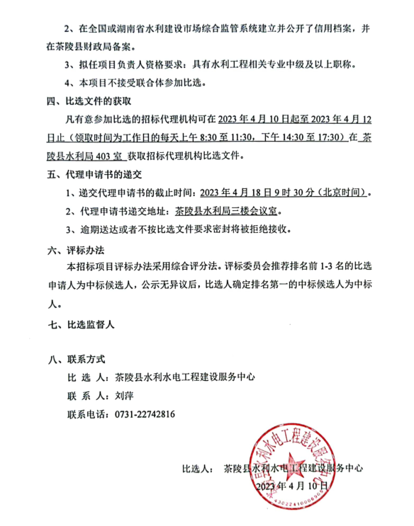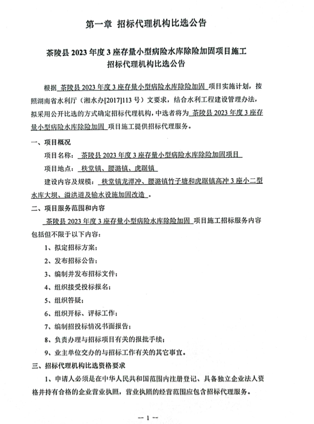 2023年水库施工招标代理机构比选公告