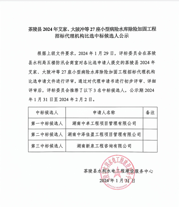 茶陵县2024年艾家、大陂冲等27座小型病险水库除险加固工程 招标代理机构比选中标候选人公示