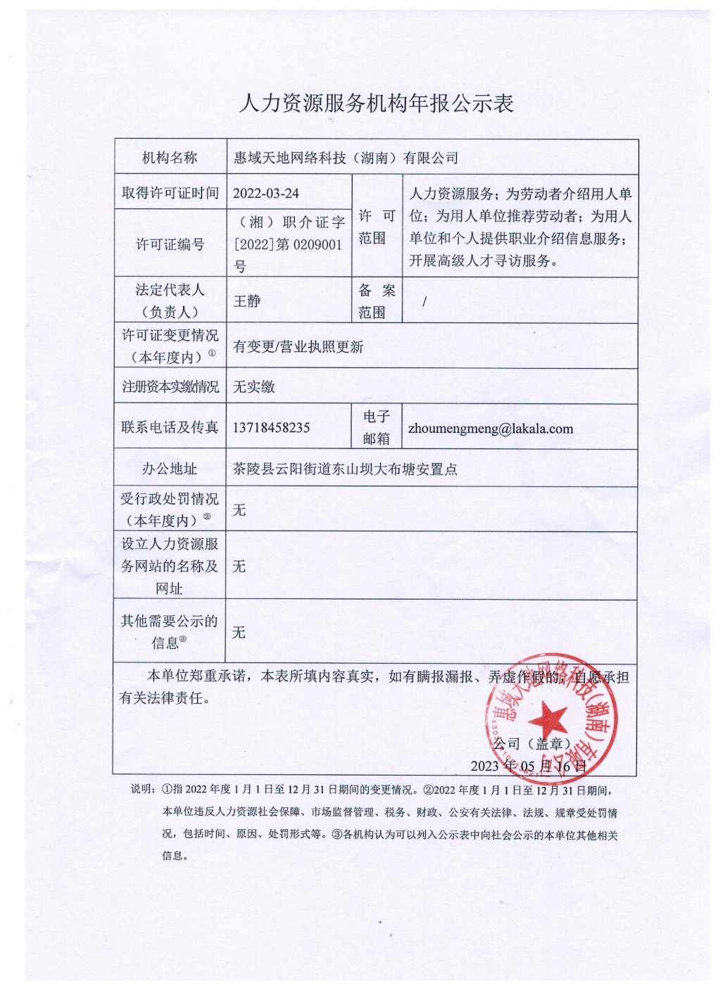 3、人力资源服务机构年报公示表(惠域天地网络科技<湖南>有限公司)