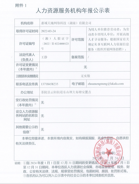 3、人力资源服务机构年报公示表(惠域天地网络科技<湖南>有限公司)